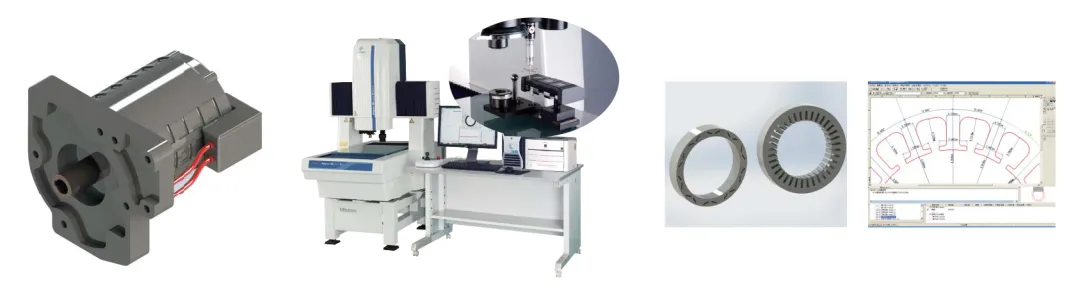 使用配有觸發式測頭的影像測量機可以高效地測量層疊前沖壓單品和層疊品。薄且平的層壓前單品可以使用影像測量模式、層壓后的扭曲和偏移等三維的評估可以使用觸發式測頭模式。此外,轉子外徑、定子內徑的圓柱度測量可使用圓度測量儀進行測量。