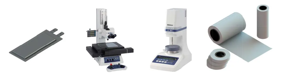 正極和負極絕緣用隔離膜的厚度管理對容易誘發破裂和起火的鋰離子電池的制造工序而言是不可或缺的。能夠以低測力最大限度降低對材料的影響的臺式低測力測高儀是最適合的。此外,測量顯微鏡可對層壓型鋰離子電池內部有無異物進行檢查(需要切斷)。