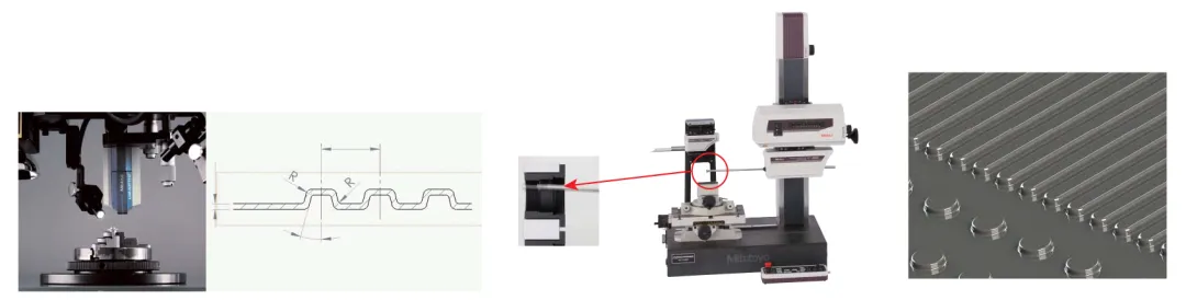 為形成用于擴散氣體的流路,燃料電池的隔離板被加工成微小的凹凸形狀。使用具有最小直徑15μm、最小1μN的超低測力測針的細微形狀測量系統UMAP,在角R、間距、角度等方面,實現了高可靠性的測量。此外,厚度的測量方面,靈活運用了通過與兩側圓錐測針的組合實現上下面的連續測量的輪廓形狀測量機。